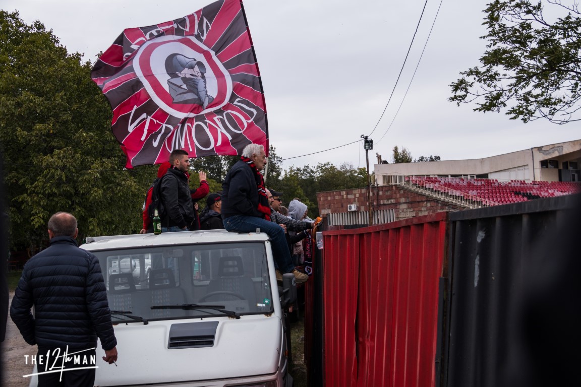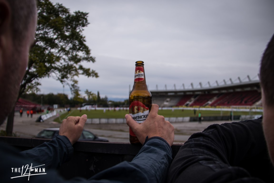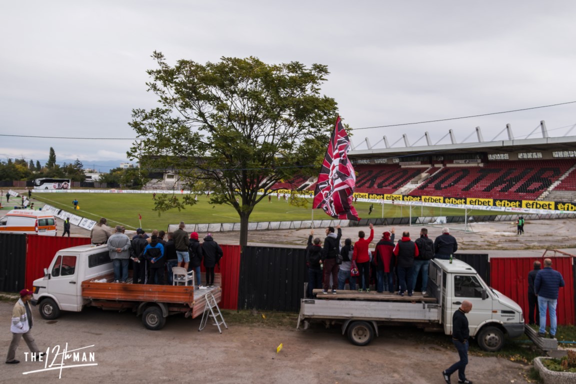 Two pick-ups came down to the stadium and together with a small shack plus some other material they quickly set-up their alternative stand. With a lot of booze we were invited to watch the match together with them. A very homey atmosphere, despite the stickers we got from them saying “Groundhoppers not welcome”. It is Bulgarian relegayion football at their best.